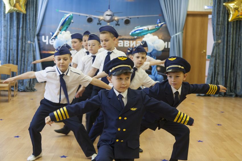 Основой становятся элегантные силуэты, строгие линии и аккуратные детали. Для юношей — костюмы в тёмных оттенках, рубашки, галстуки или шейные платки, элементы формы пилота в виде фуражек или значков. Для девушек — платья или костюмы в духе стюардесс, сдержанная цветовая палитра, аккуратные аксессуары, шёлковые платки, перчатки или миниатюрные чемоданы как часть образа.