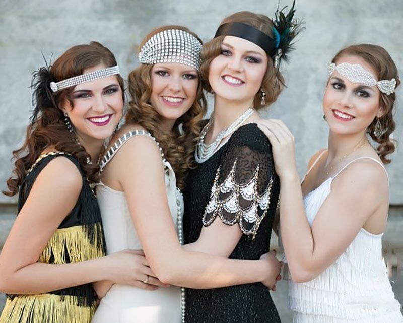 1. Причёска — идеально подойдут укладки в духе двадцатых годов: лёгкие волны на одну сторону, короткие каре с завивкой или высокие ретро-пучки. Для длинных волос можно добавить декоративные повязки, ленты или винтажные заколки с блёстками и перьями.