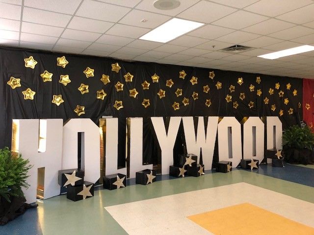 2. Золотые элементы и реквизит. Используйте мини-статуэтки «Оскар», звёзды, катушки с плёнкой, гигантские очки, мегафоны и таблички с надписями в стиле Голливуда. Всё это позволит выпускникам позировать в интересных сценках.